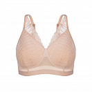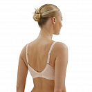 Поверх гладкой чашки, которая придает бюсту красивую округлую форму, проходит кружевное полотно с орнаментом в горошек, имитирующее бралетт. Завышенная линия декольте, высокая пройма и широкая спинка, которая у застежки становится выше, а также кружево, заходящее на бретели, скрывают возможные неровности и гарантируют безупречную посадку.