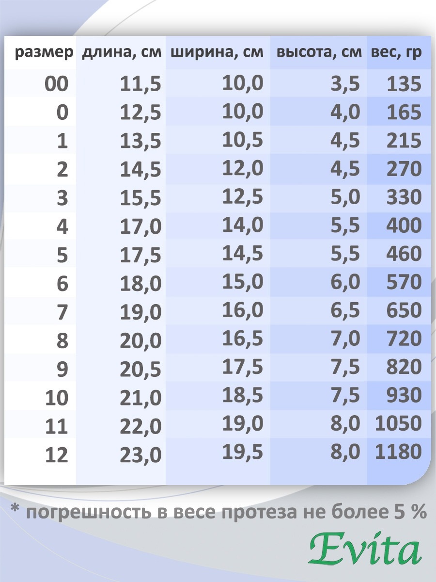 - Мысленно проведите линию влево и определите какой экзопротез соответствует вашему размеру белья.
