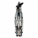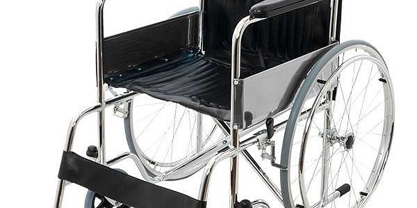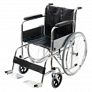 Складная стальная коляска с фиксированными спинкой, подлокотниками и подножками. Материл обивки — качественная экокожа — надежный, устойчивый к истиранию и имеющий презентабельный вид.