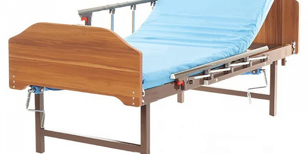 Экономичная двух-функциональная кровать с переворотом (поворотом) больного с помощью винтовых регулировок ложа и независимыми винтовыми регулировками угла наклона спинной секции.